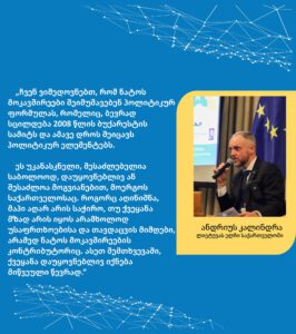 „ქართული პერსპექტივიდან, მნიშვნელოვანია ერთმანეთისაგან განვასხვავოთ პოლიტიკური და გეოგრაფიული ევროპა. თავად საქართველო საკუთარ თავს პოლიტიკური ევროპის ნაწილად მიიჩნევს, მიუხედავად იმისა, რომ გეოგრაფიულად ის კავკასიაში მდებარეობს. საქართველო სწორედ ის ადგილია, სადაც რუსეთი დასავლეთს ებრძვის გავლენისთვის და ცდილობს იმის ჩვენებას, რომ საქართველო მუდმივად მის მიერ დომინირებული სამეზობლოს ნაწილი იქნება. ქართველებისთვის იქმნება განცდა, რომ ევროკავშირი და ნატო „რკინის ფარდას“ აშენებს, და ქვეყნები, რომლებიც ამ ფარდის მიღმა ექცევიან, მათ საზრუნავს აღარ წარმოადგენს“.
